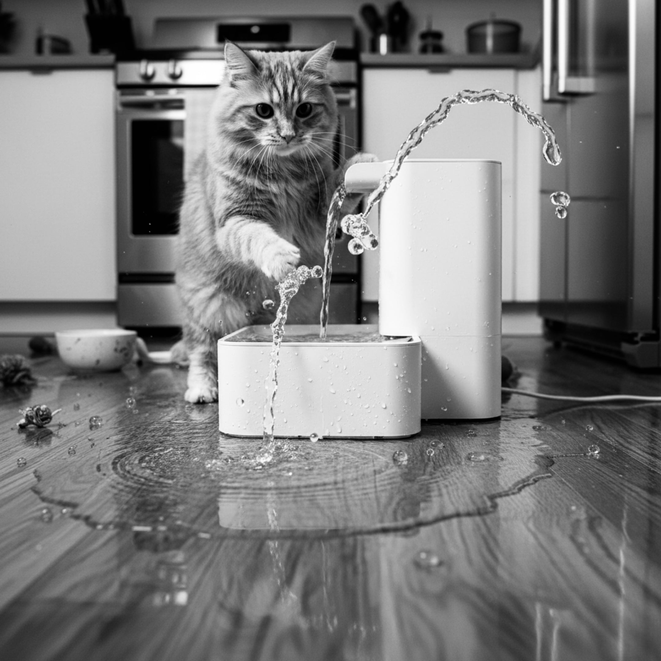 No, never. The dual-tank design keeps clean water completely separate, ensuring your pet always drinks fresh, hygienic water.